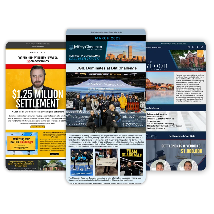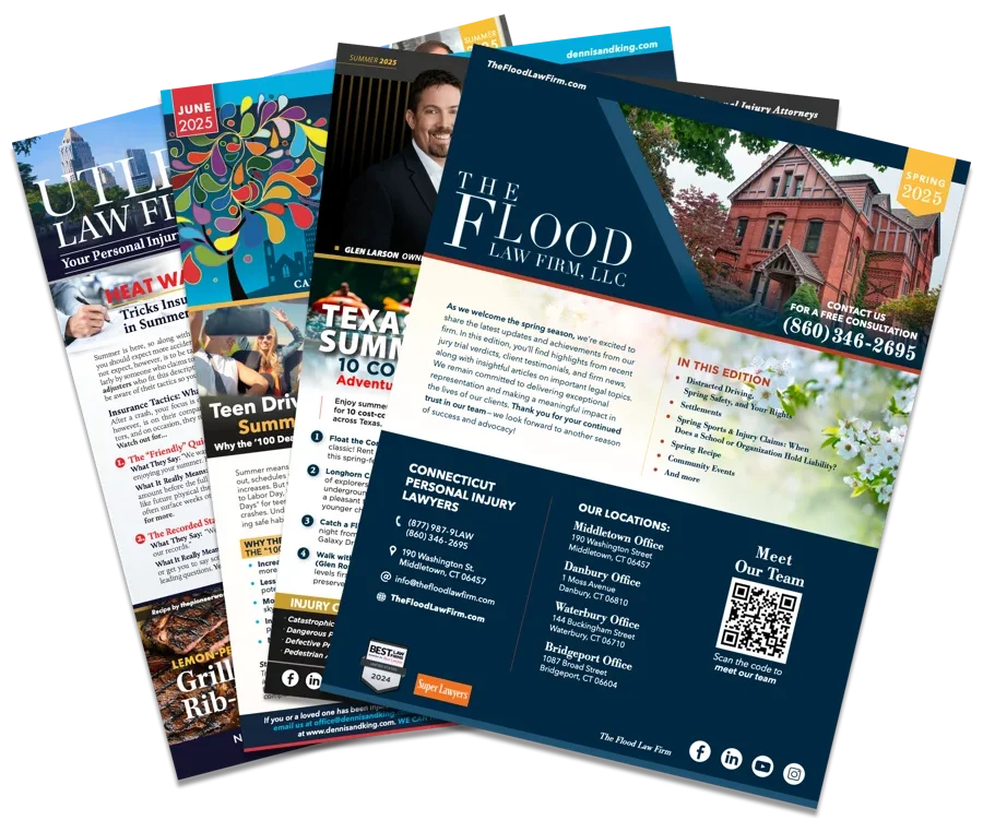 Printed marketing collateral stands out in a digital world. Custom newsletters and postcards extend your firm’s brand beyond the screen, delivering timely updates, legal education, community news, and personalized messages that keep your firm familiar and trusted all year long.