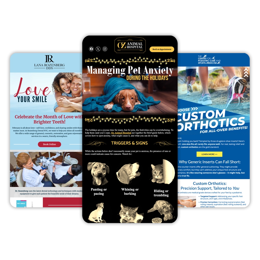 Printed marketing pieces stand out in a digital world. Custom newsletters and postcards extend your practice’s brand beyond the screen, delivering timely updates, seasonal education, and personalized messages that keep your practice familiar and trusted over time.