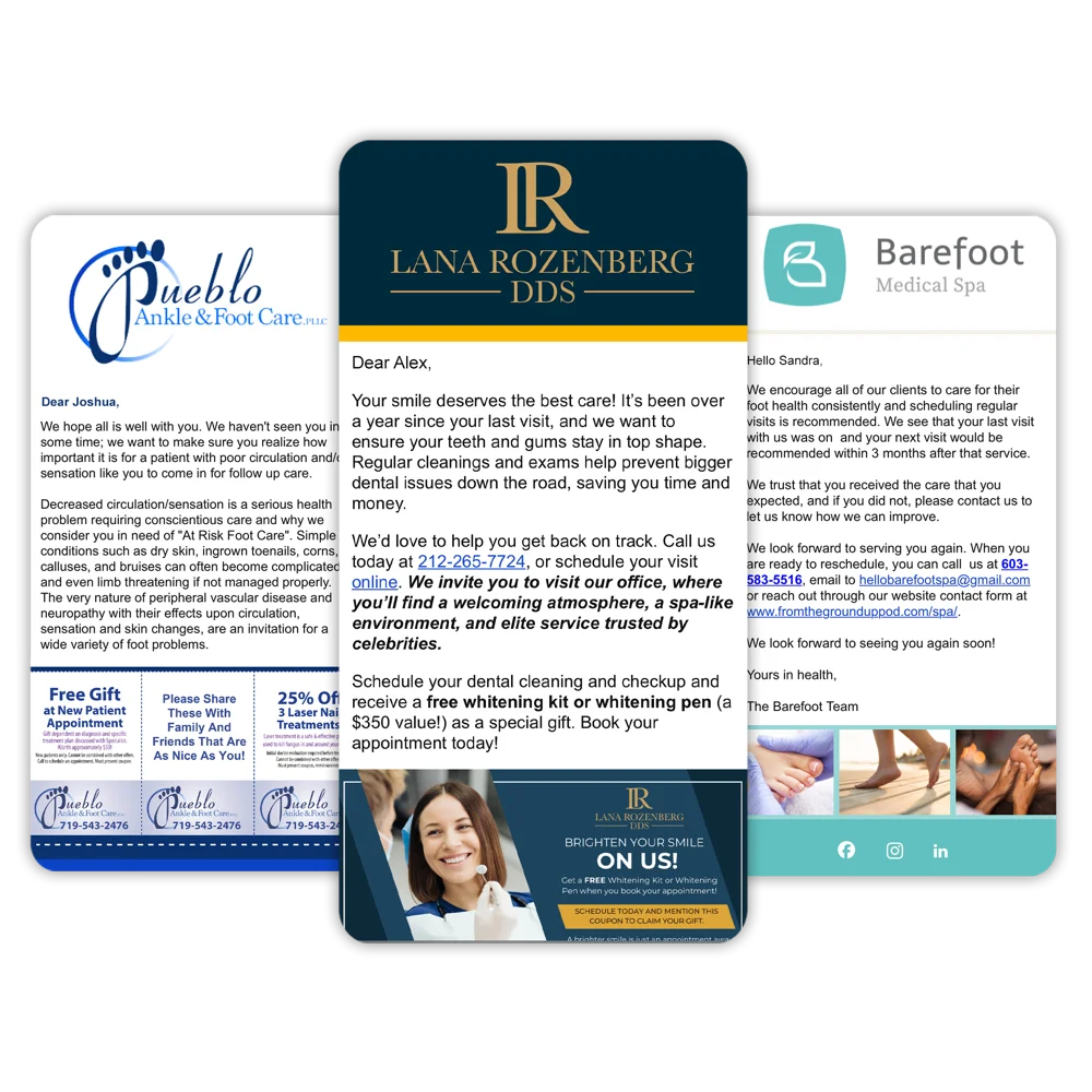 Email marketing helps you stay in touch with patients, build trust, and highlight the services and treatment options your practice offers. Customized, HIPAA-compliant email campaigns deliver consistent, professional communications every month, strengthening patient relationships and keeping your practice top of mind.